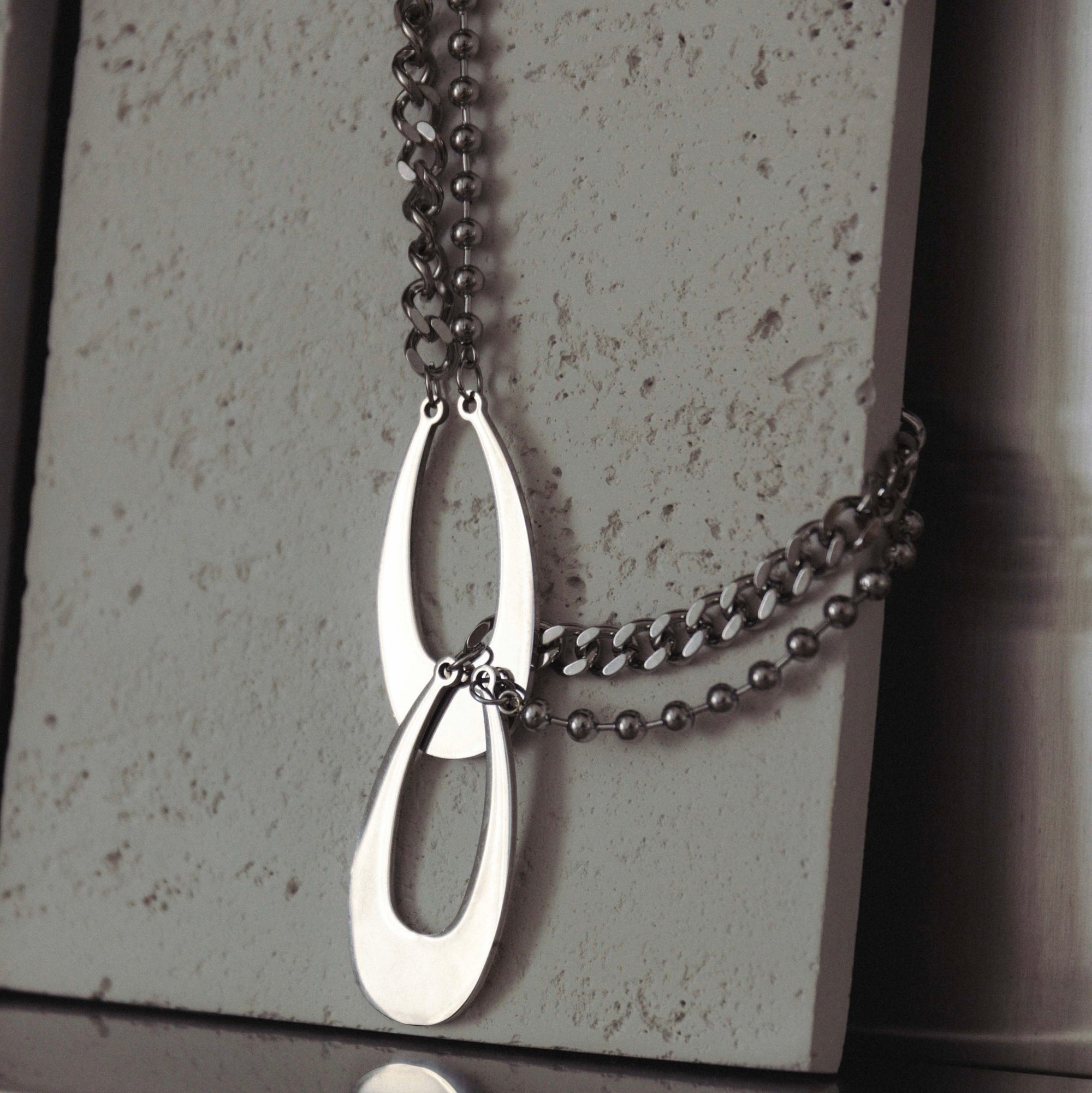 This necklace features a bold, sculptural pendant with interlocking loops, creating a modern and artistic statement.